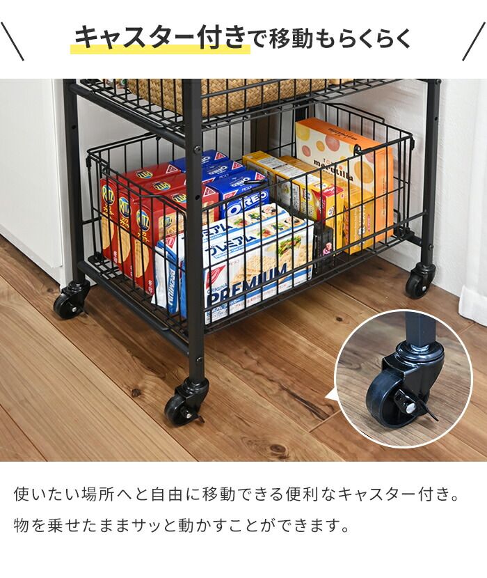 ・大・小2種類のバスケット付きで、食品や日用品、雑貨の整理に最適