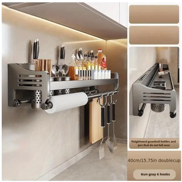 ステンレス製壁掛けキッチン収納ラック ドリル不要のメタルオーガナイザー 調理器具 包丁 スパイスに適した 二重カップ保護デザイン付き