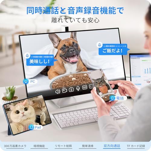 【一瞬を見逃さない】自動給餌器猫 カメラ付きに搭載された300万画素のフルHDカメラは、ペットが家で遊んでいる瞬間を鮮明に記録します。(トリック・オア・トリートの瞬間を記録することも可能) また、カメラを通して、ステンレス製ボウルに残ったペットの食事を見ることもできます。夜間でも、カメラの赤外線センサーがクリアな夜間視界を提供。撮影・録画機能に加え、データはMicro SDカード(最大128GB)やクラウドストレージに保存できます。動体検知機能をオンにすると、猫が動いた際にアプリで通知を受け取るます。
