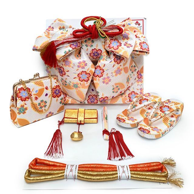 7歳女の子用の古典柄の四つ身の着物に、結び帯とはこせこ小物セット・しごきや帯揚げをコーディネートし、その他着付けに必要な小物まで揃えたフルセットでの販売です。