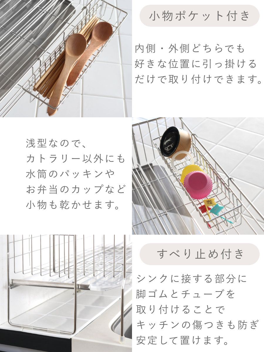 ●小物ポケット付きでカトラリーやお弁当グッズなども隙間から落ちずに乾燥できます。