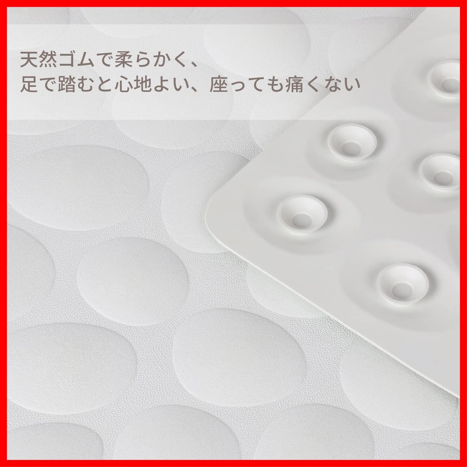 【安全安心】本製品は吸盤で安定性抜群!表面が滑り防止のためのコブルストーンような凸凹のあるデザインで、乗っても滑りにくくなっています。裏面が全面に吸盤で床としっかり吸着固定、ズルズル動いたりしません。耐熱温度が70℃まで、お湯を張った浴槽でも安心して使えます。