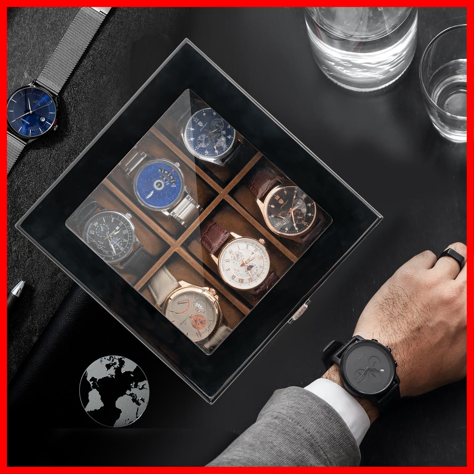 ProCase メンズ木製腕時計ボックス 6スロット ラッカー仕上げ ガラストップ付き 2段ディスプレイケース 父の日ギフト(ブラック)