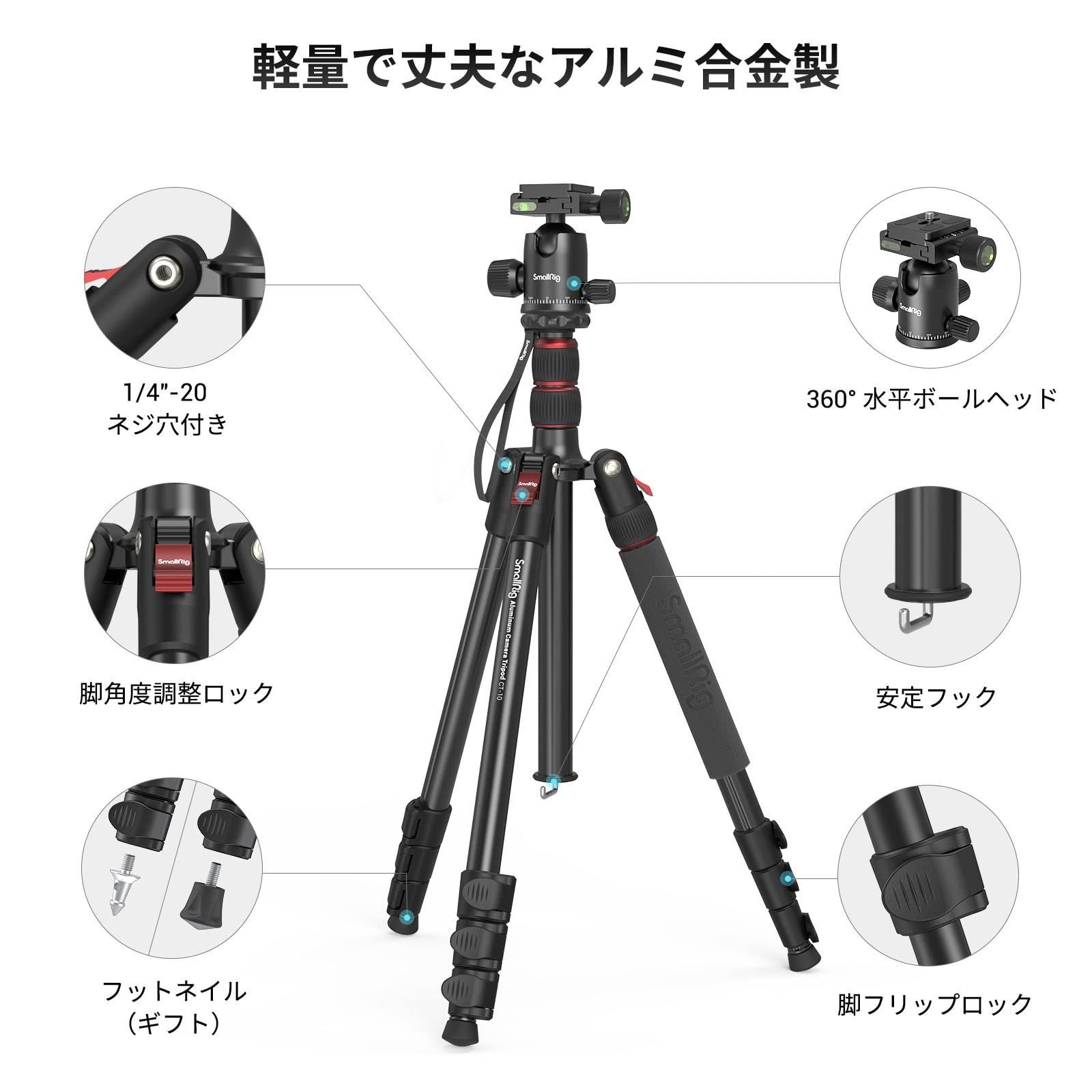 SmallRig カメラ用三脚 全高180cm 一脚可変式 360°自由雲台付き クイックシュー式三脚 コンパクト アルミ製 耐荷重15kg 4段調整 中心軸反転可能 スマホクリップ付き-3935