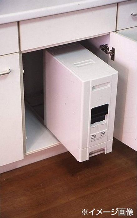キッチンキャビネット内に付属ネジ4本にてレール部を固定するタイプです。お米は上から入れて下から出す先入先出方式になっています。0.5合・1合の計量つまみ付きで便利。小窓付きで残りのお米の量も分り易い仕様です。