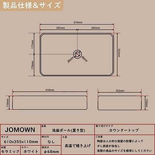 【高品質&掃除しやすい】:JOMOWNの手洗器は1280以上の高温で焼き上げております。 伝統工芸とモダンのデザインを組み合わせる白い洗面ボウルは洗面所の全体が清潔でシャープな印象を残しやすいです。洗面器の表面には釉薬が採用して、滑らかで光沢があります。表面が滑らかで汚れが溜まりにくいので、サッとふくだけで、きれいになります。