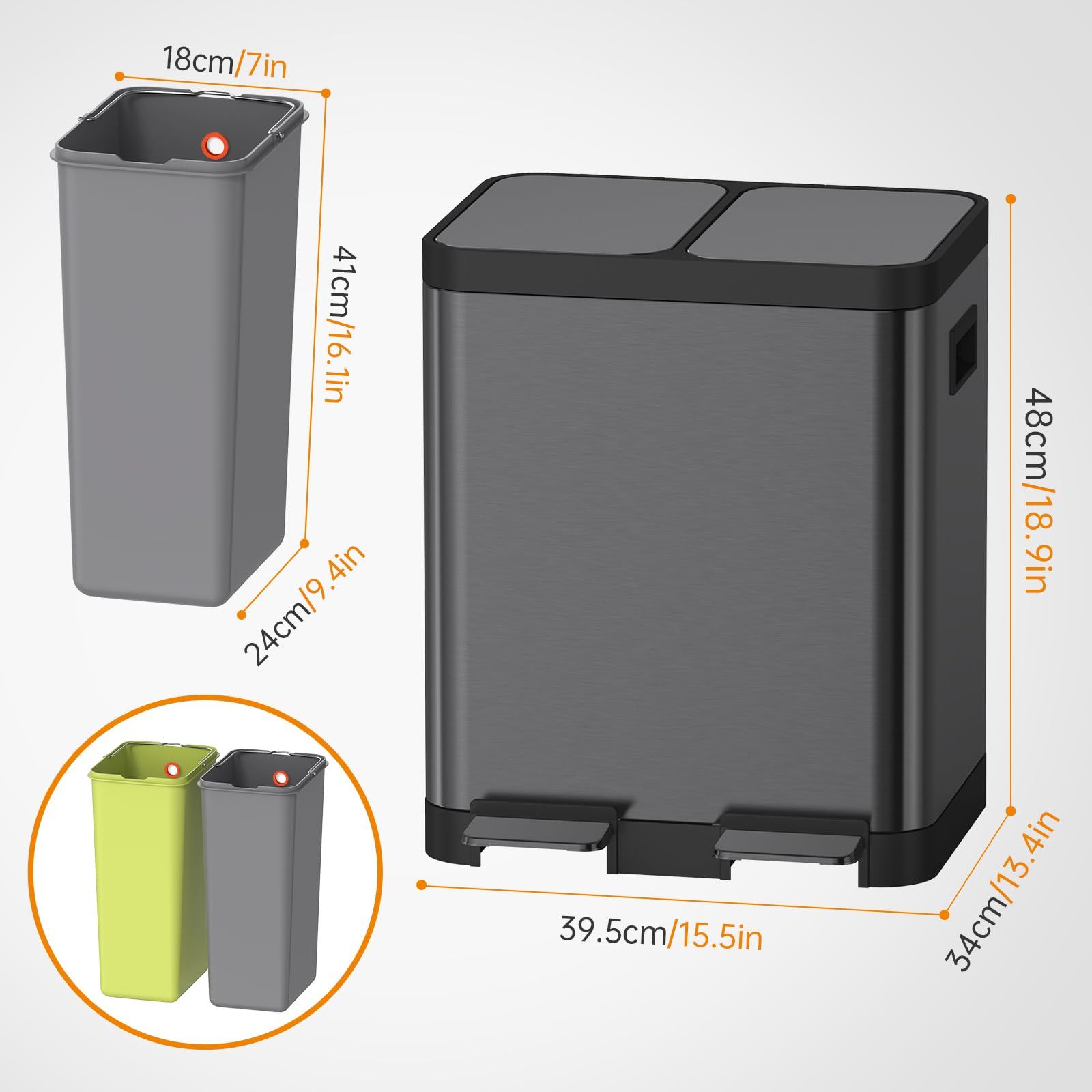 【商品仕樣】ひと包みゴミ袋を贈ります。ゴミ箱のサイズ:高さ48cm、幅39.5cm、奥行き34cm(ペダルを含む)。ゴミ箱の容量:15L+15L。ゴミ箱の素材:430ステンレス、ABS樹脂。当店は安全で高品質な製品を提供し、安心的なサービスによる顧客満足を心掛けております。購入日からアフターがついておりますので、輸送途中の破損や初期不良が発生した場合は当店にご連絡ください。当店はさらなる顧客満足度の向上を図ってまいりますので、何卒宜しくお願い申し上げます。
