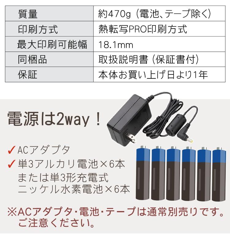 【寸法】約55(W)×133(D)×144(H)㎜【質量】約470g(電池、テープ除く)【電源】2way電源[ACアダプタ(別売)、単3形アルカリ乾電池×6本(別売)または単3形充電式ニッケル水素電池×6本(別売)] 専用アプリには豊富なテンプレートを搭載。 印字速度(最大):12mm/秒