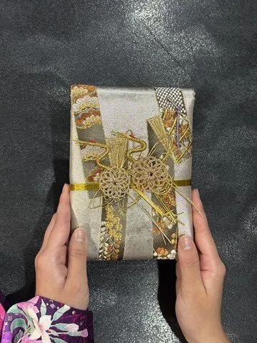 着物/帯から作られたご祝儀袋です水引もイメージに合わせて仕上げました