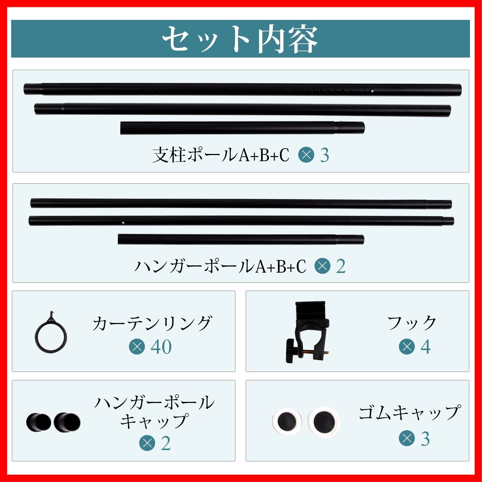 【材質】スチール(エポキシ樹脂塗装) ポリプロピレン ABS樹脂 ポリ塩化ビニル 【寸法】メイン縦棒のみ:110-160cm メイン+延長棒(短):160-210cm メイン+延長棒(長):210-260cm メイン+延長棒(短+長):260-310cm 【付属品】カーテンリング30個 カーテンは付属しておりません。