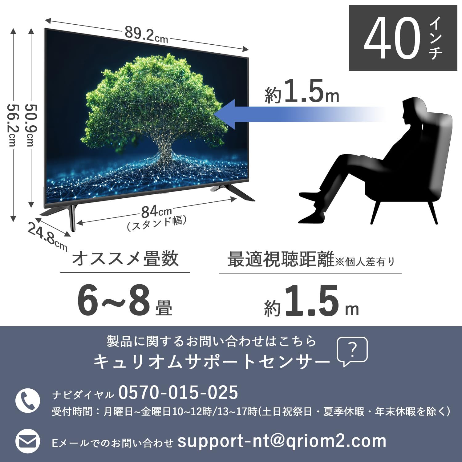 【商品仕様】◇本体寸法(幅×奥行×高さ):スタンドなし892.4×85.5×508.9mm スタンドつき892.4×248.1×562.1mm ◇本体質量:スタンドなし5.5kg スタンドつき5.6kg ◇画面サイズ:40V型 ◇解像度:1920×1080 ◇コントラスト比:5000:1 ◇視野角(最小値):左右=約178°/上下=約178° ◇応答速度:8.5ms ◇音声出力(スピーカー):8W+8W ◇チューナー:地上デジタル×2、BS、110度CSデジタル×2(ダブルチューナー)※1つは視聴専用・2番組同時録画は非対応 ◇壁掛け寸法:VESA規格200×100mm ◇定格電源:AC100V(50/60Hz) ◇消費電力:75W ◇HDMI:HDMI Ver.1.4a×2 CEC機能に対応※HDMI入力1のみARCに対応 ◇USB端子:USB2.0×2 ◇付属品:リモコン、リモコン用単4形乾電池×2(動作確認用)、miniB-CASカード、miniAV交換アダプター、スタンド、スタンド固定ネジ×4、付き取扱説明書