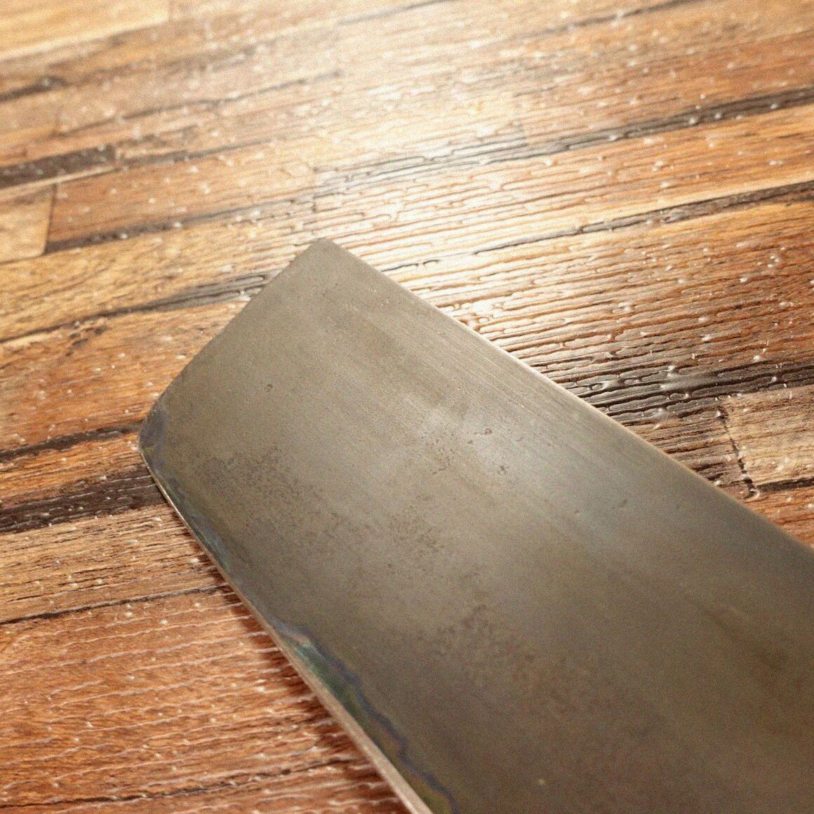 このお品は両刃のハガネ製です。手造りの非常に造りのいい菜切り包丁です。黒錆加工をして仕上げております。刃元は刃厚で刃先に行くほど細くなっているお品です。