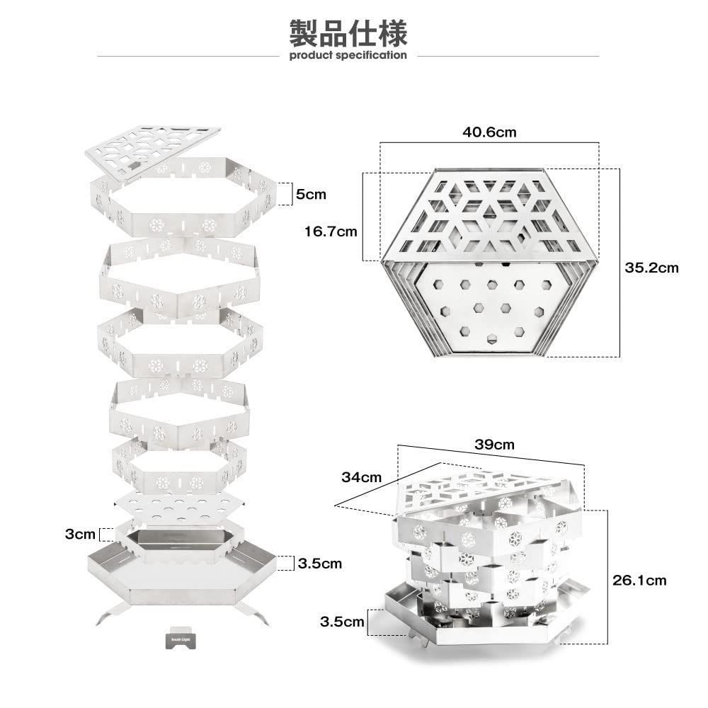 【重ね付け焚火台/2-5枚リングで高さ調節】キャンプを楽しむSouth Lightの焚き火台シリーズ。六面リングプレートが重ね付けされた焚火台。寺院建築様式の美称とされる宝塔を彷彿とさせます。番号順に大きなリングを30°回転させながら組み上げます。約30秒、あっと言う間に完成。リング2-5枚を使用して高さ調整可能です。