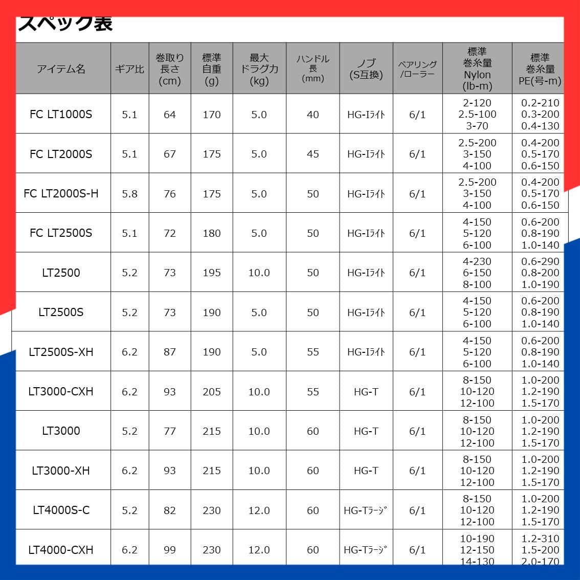 標準巻糸量:ナイロン(lb-m) 4-150、5-120、6-100 / PE(号-m) 0.6-200、0.8-190、1.0-140