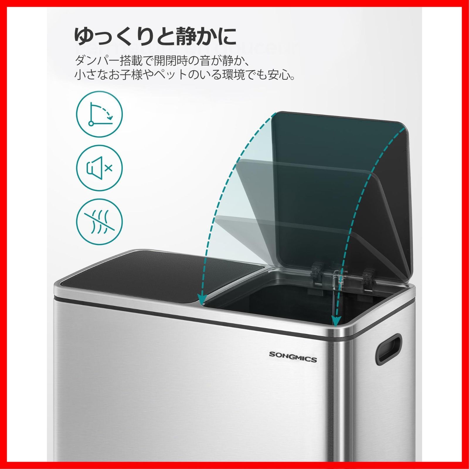 蓋付き ベランダ キチン 室内 横型 おしゃれ 音無し 密閉 ステンレス インナーバケット2つ ポリ袋付き 2 40 L 2分別 ペダル式 ダストボックス ゴミ箱 SONGMICS