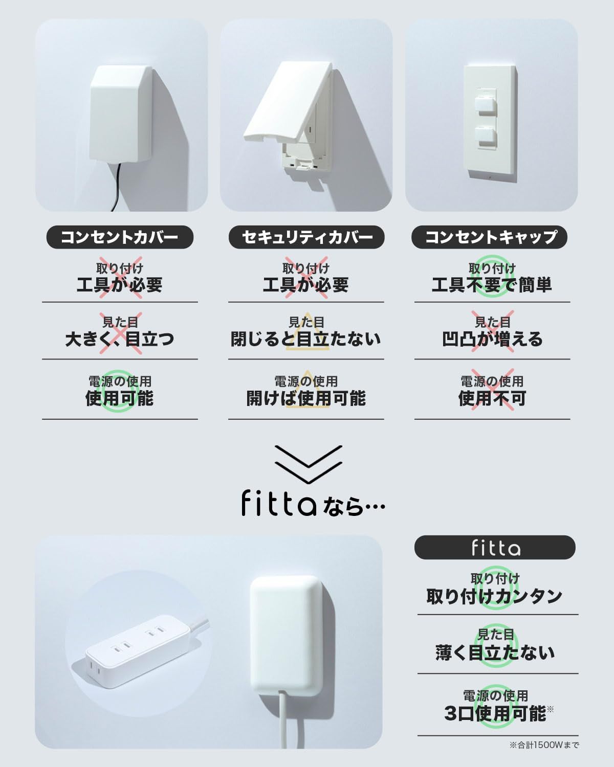 【壁にとけこむ 電源タップ 】パッと取り付けて生活感をなくす!薄型コンセントカバー付き電源タップ fitta (フィッタ)。ご家庭はもちろん、オフィスや店舗などあらゆるシーンのコンセント周りをスッキリ美しく。