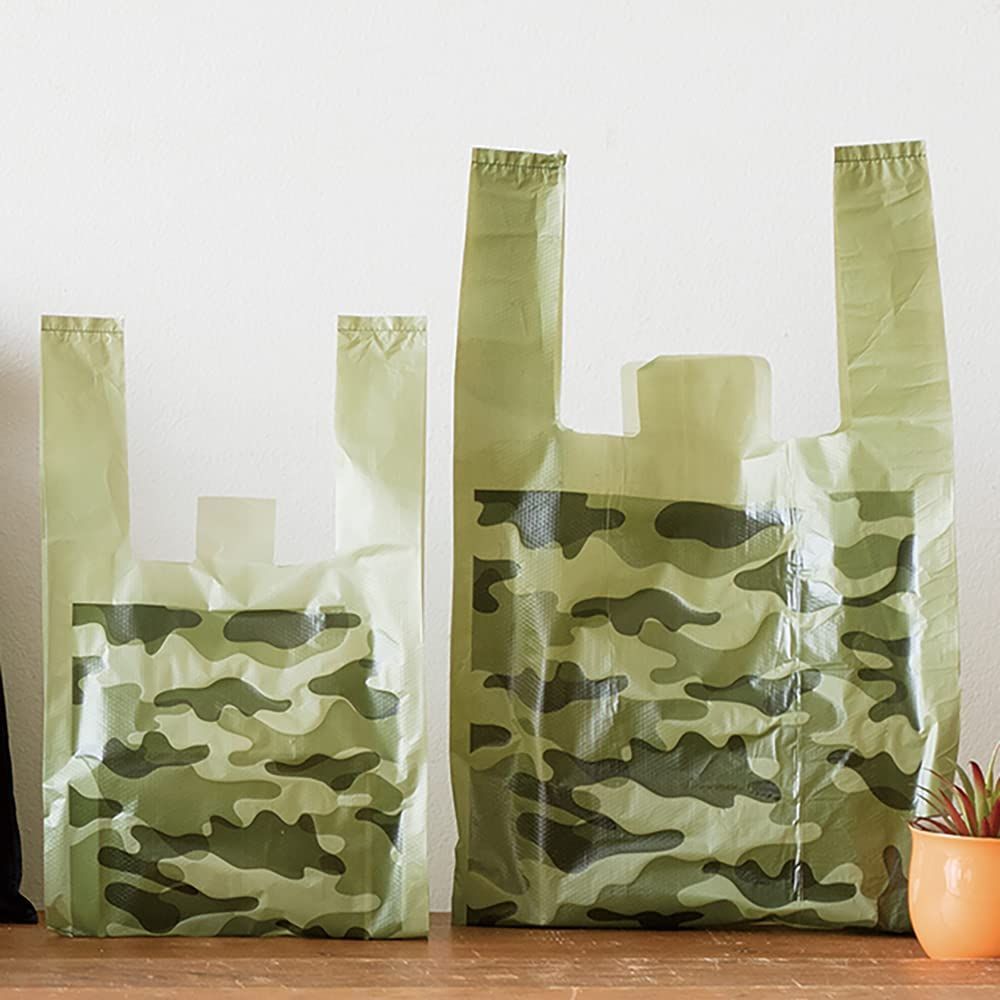 迷彩柄で、かっこいい印象のレジ袋です。前面のみに柄を取り入れることで派手になりすぎず、男性も女性も使いやすいデザインです。
