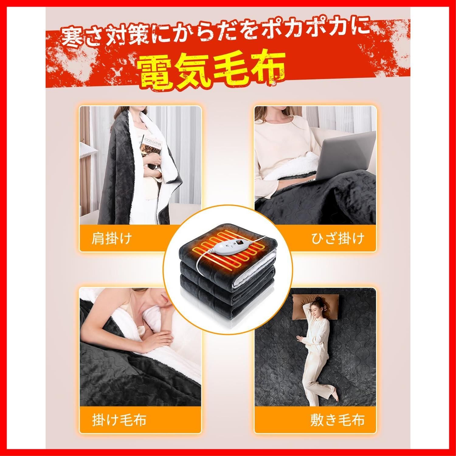 【場所を問わず冬に大活躍&様々な使い方&暖かい贈り物】男女兼用の電気毛布のサイズは160×130cmで、多くの場合に適しています。例えばキャンプ、ピクニック、ソファー、ベッド、オフィス、椅子、車など。夏、エアコン付きの部屋なかでこのまま使って十分です。冬に電気かけ毛布、春と秋に普通の毛布として使えますが、日ごろにひざ掛けとしてもぴったりです。また電気ブランケットは肩掛け、腹掛け、膝掛け毛布などとしてご使用もできます。テレビ、読書、リラックスまたは睡眠時に気持ち良い暖かさを与えてくれます。自分へのご褒美から父、母、奥様、彼女、友人など、ファミリー層にも一人暮らしの方にもとても人気あるギフトでしょう。誕生日 や引越し、クリスマス、新年などのプレゼントに最適です。