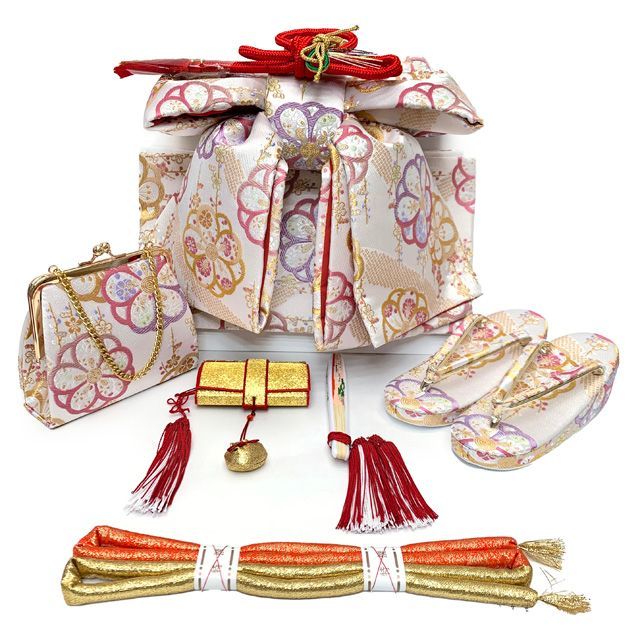 裾前に鮮やかな金彩が施された合繊(ポリエステル) 七歳女の子四つ身の着物に、結び帯やハコセコセットをコーディネートしたフルセットです。