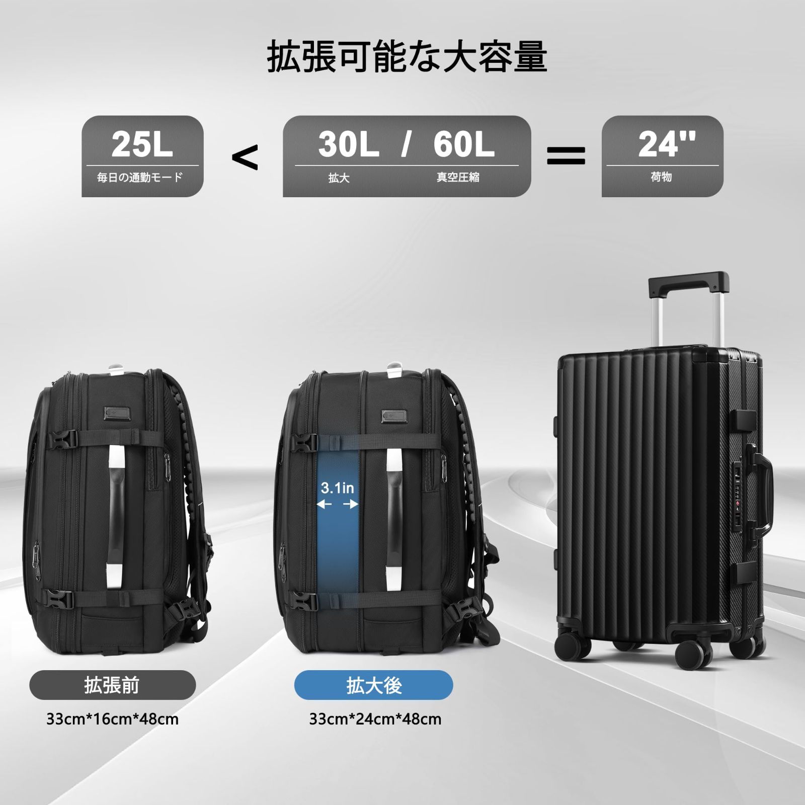 最大60リットルまで拡張可能な容量:このバックパックは、機内持ち込み可能なコンパクトなサイズ(12 x 7.8 x 20インチ)を保ちながら、24インチのキャスター付きスーツケースに相当する60リットルの容量まで拡張できます。追加手荷物料金を気にせず、快適に旅行できます。