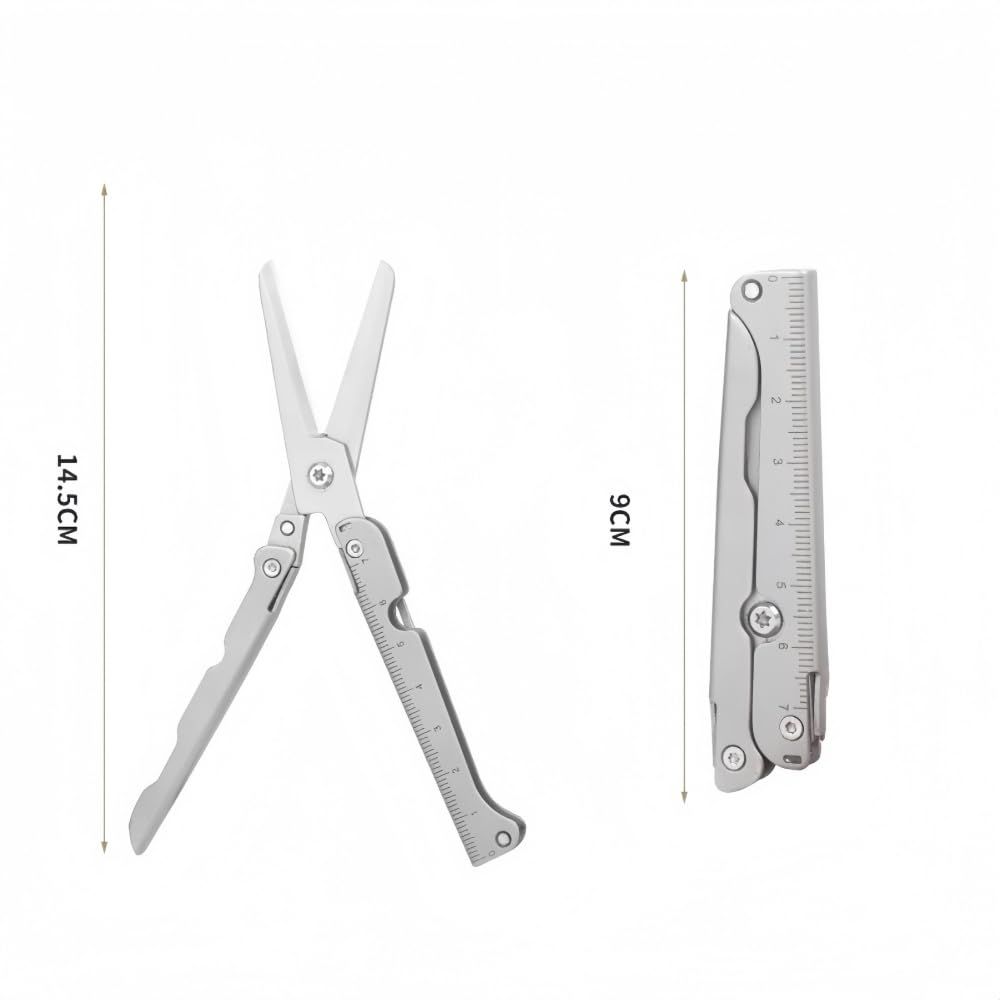 【多機能 & 実用性重視】ハンドル部分に 目盛り(定規機能) を内蔵、簡単な計測もその場で可能。コンパクトな収納状態から、広げれば 約14.5cm のフルサイズハサミに変身。アウトドアでの緊急時から家庭内のちょっとした作業まで、様々なシーンで活躍する問題解決ツールです。
