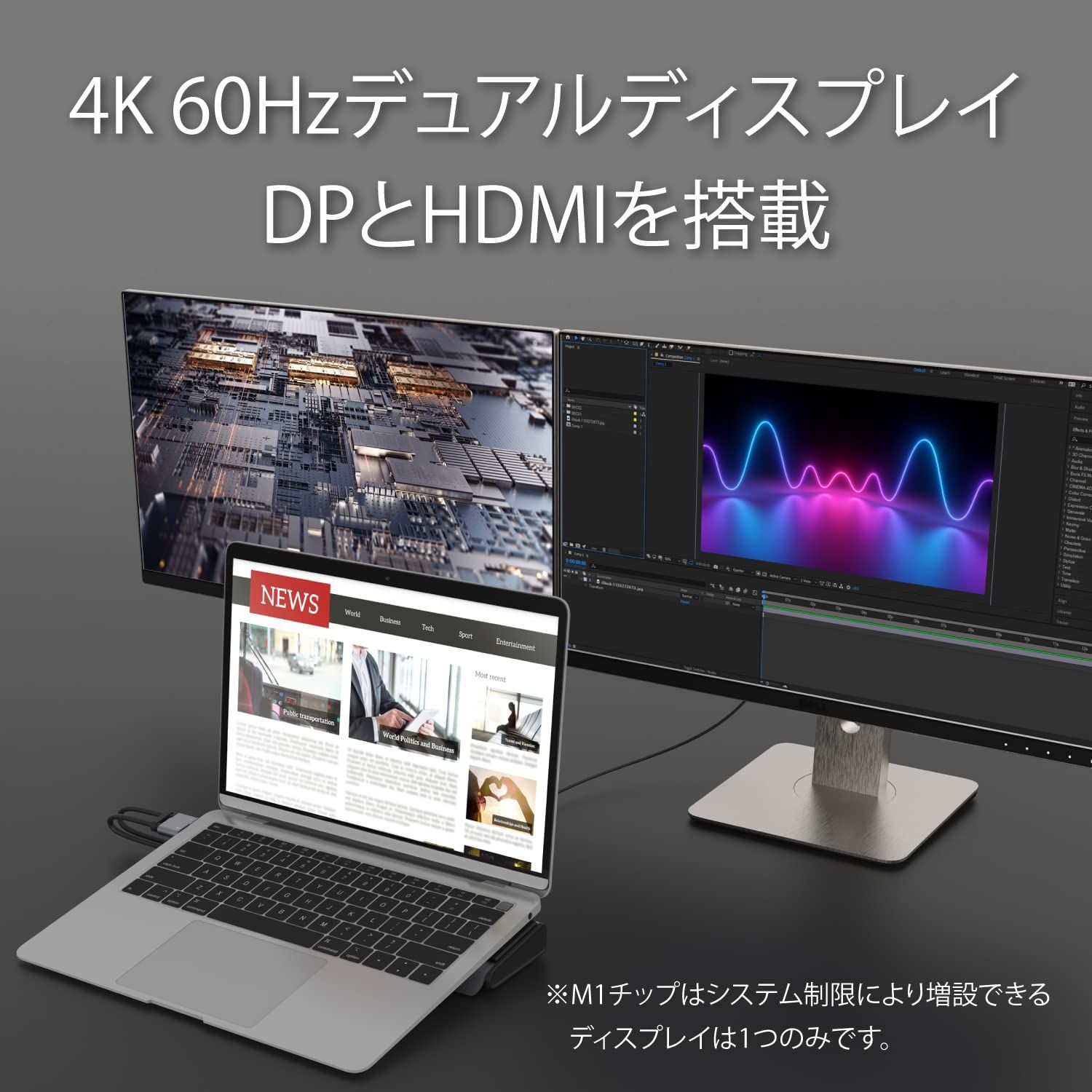 【デュアル4K 60Hzディスプレイ対応】 MacBook Pro / MacBook Air(Intel 搭載モデル) で、HDMI & DisplayPort のデュアル4K出力 を実現。他のUSB-C対応ノートPCでも、HDMIによるシングルディスプレイ出力 に対応し、高解像度のマルチタスク環境を提供します。※M1/M2/M3チップ搭載のMacは1つのディスプレイのみサポート。 注意: 2台の外部モニターを接続するには、ノートパソコンにDP Alt Mode対応のUSB-Cポートが2つ必要です。対応ポートが1つの場合は、接続できる外部モニターは1台のみです。