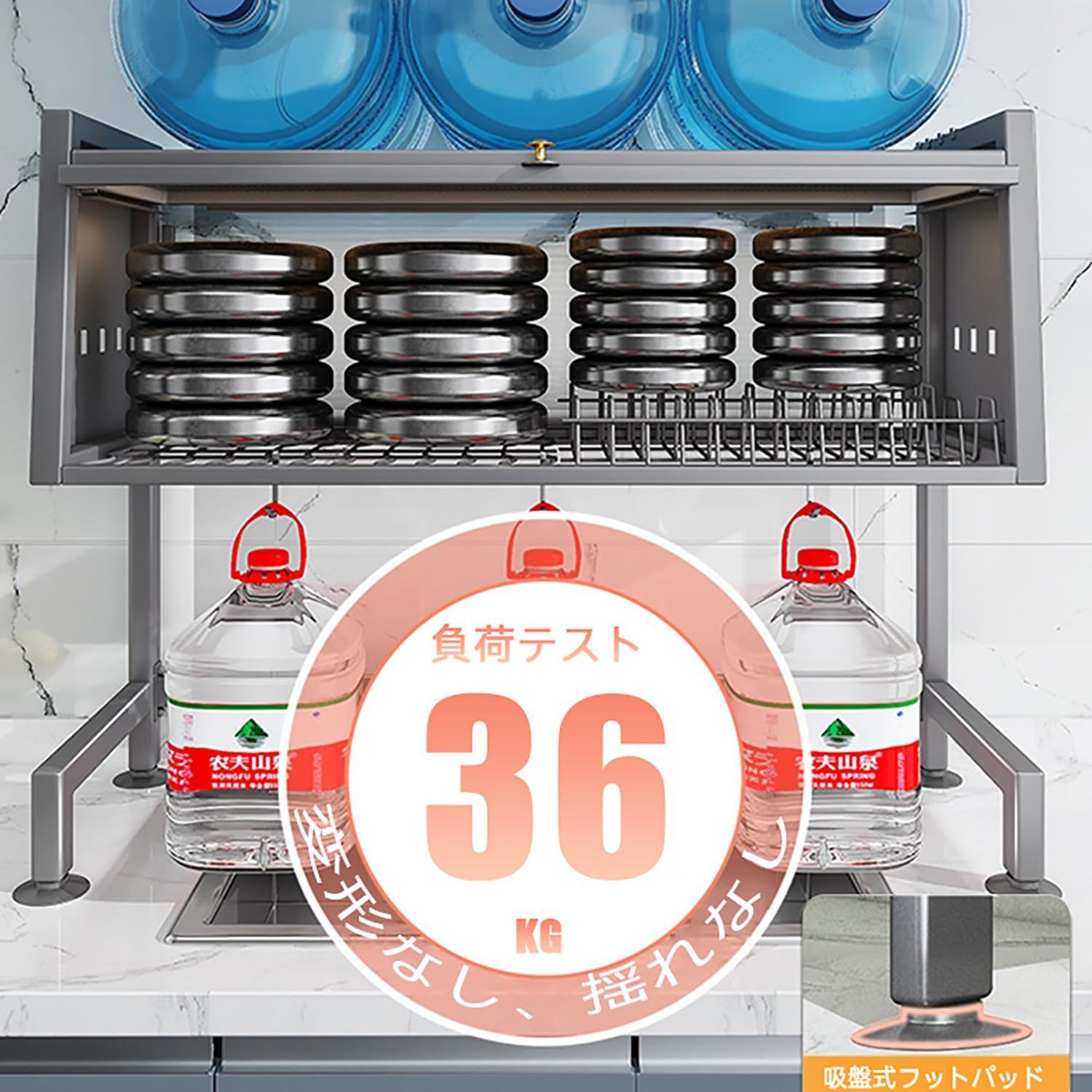 「安定感のある構造」優れた金属加工技術で作られた水切りかごは、頑丈なT字形の構造を採用しており、安定感と使い心地が抜群です。最大36kgの耐荷重性能により、ご家族分の食器やキッチン用品などを安全に収納できます。また、脚に滑り止めの吸盤が付いてるので、食器が増えて重くなってもズレる心配が少なく、より安心して使用できます。