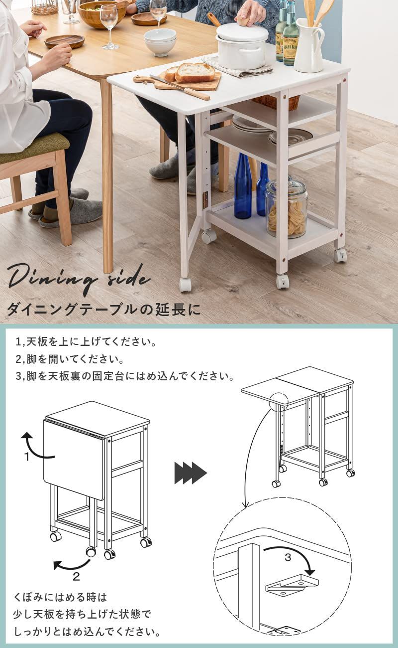 【パッと広げられるバタフライ式ワゴン】:天板を広げたらワイドな作業スペースに変身する拡張式キッチンワゴン。折りたたんでもちょい置きにピッタリな天板サイズです。