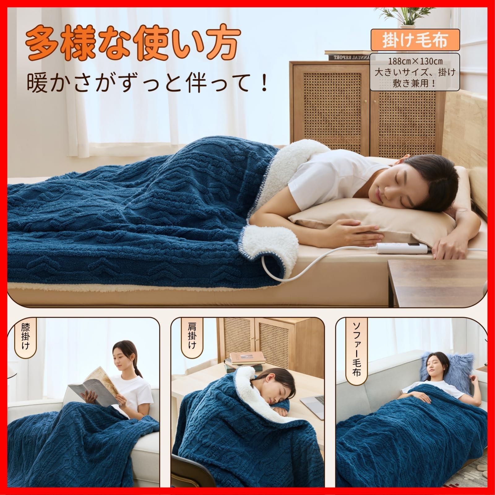 用途多様:電気毛布のサイズは188 x130cm、160 x80cm2サイズがあり、188 x130cmで高身長の方にも十分な大きさ。季節の変わり目によって冬には電気毛布として、春と秋には普通の毛布としてご利用いただけます。また、ひざ掛け、肩掛け、かけ毛布、キャンプ毛布、昼休み用電気毛布としても使用でき、使い方が多くて実用性があります。家族や友人にプレゼントとしてもいい。