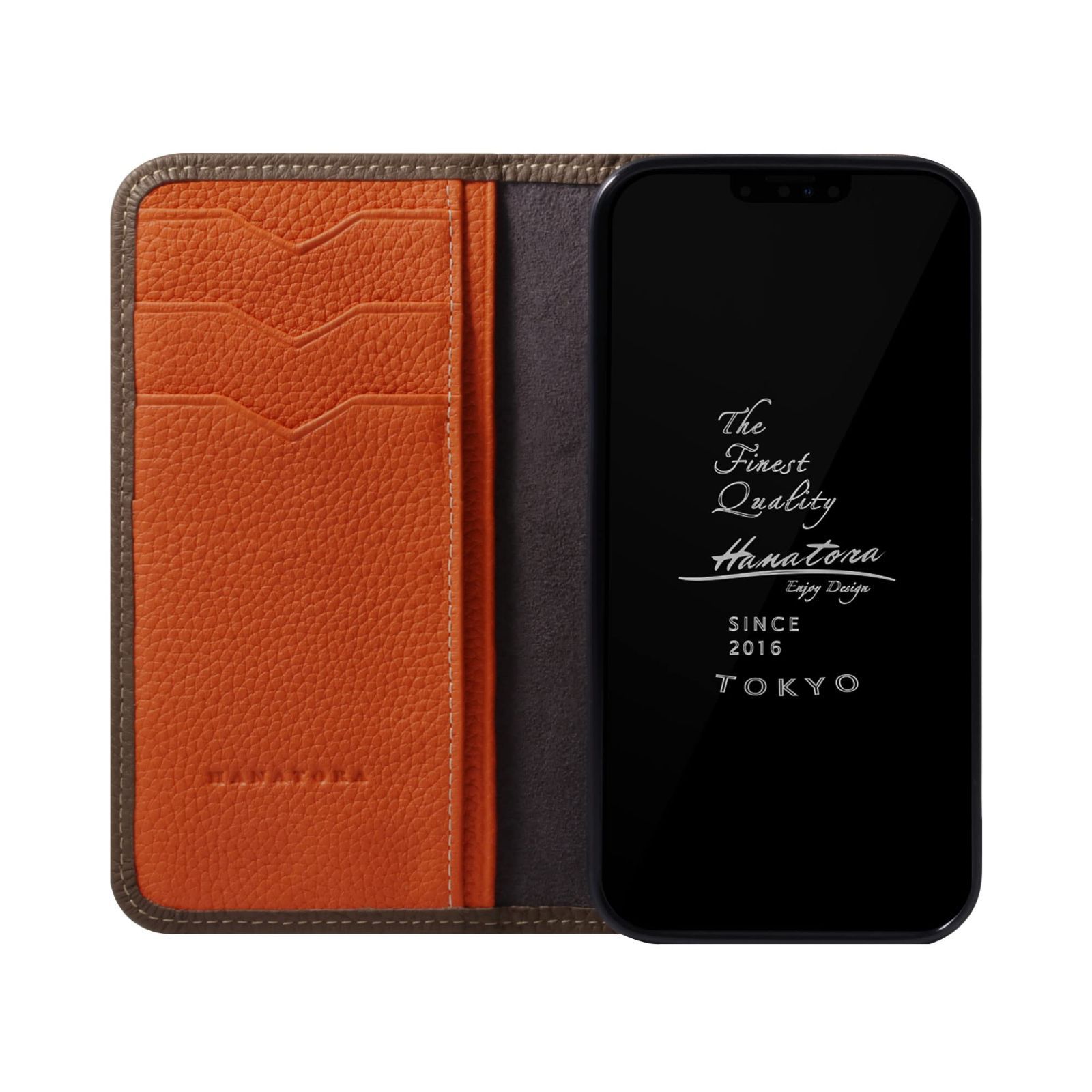 [HANATORA] iPhone13 mini ケース バイカラー 手帳型 本革 シュリンクカーフレザー スマホケース 耐衝撃 磁石不使用 マグネットなし ハンドメイド トープ オレンジ PH-13Mini-Taupe-OG