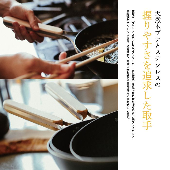 持ち手には天然木のブナ材(木柄)を採用し、ステンレスのフラットバーと組み合わせることで、手になじみやすい滑らかな質感と握りやすさを両立。見た目にも美しく、キッチンに馴染むデザインです。