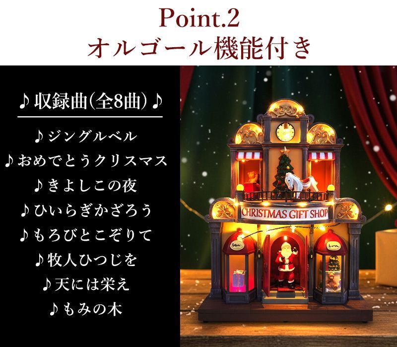 さらに下部の扉が開き、サンタクロースが登場するギミック付きで、まるで物語のワンシーンのように動きを楽しめます。