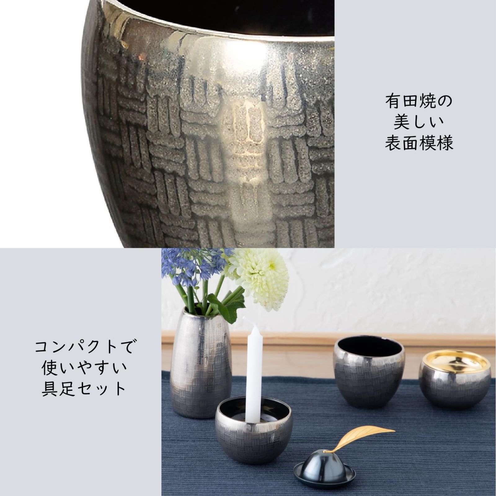 花立、灯立、寝かせる線香皿、茶湯器、仏器のセットでのご用意があります。おりんや香炉など、同一の柄のシリーズも取り揃えているため、統一感のあるお仏壇を演出できます。
