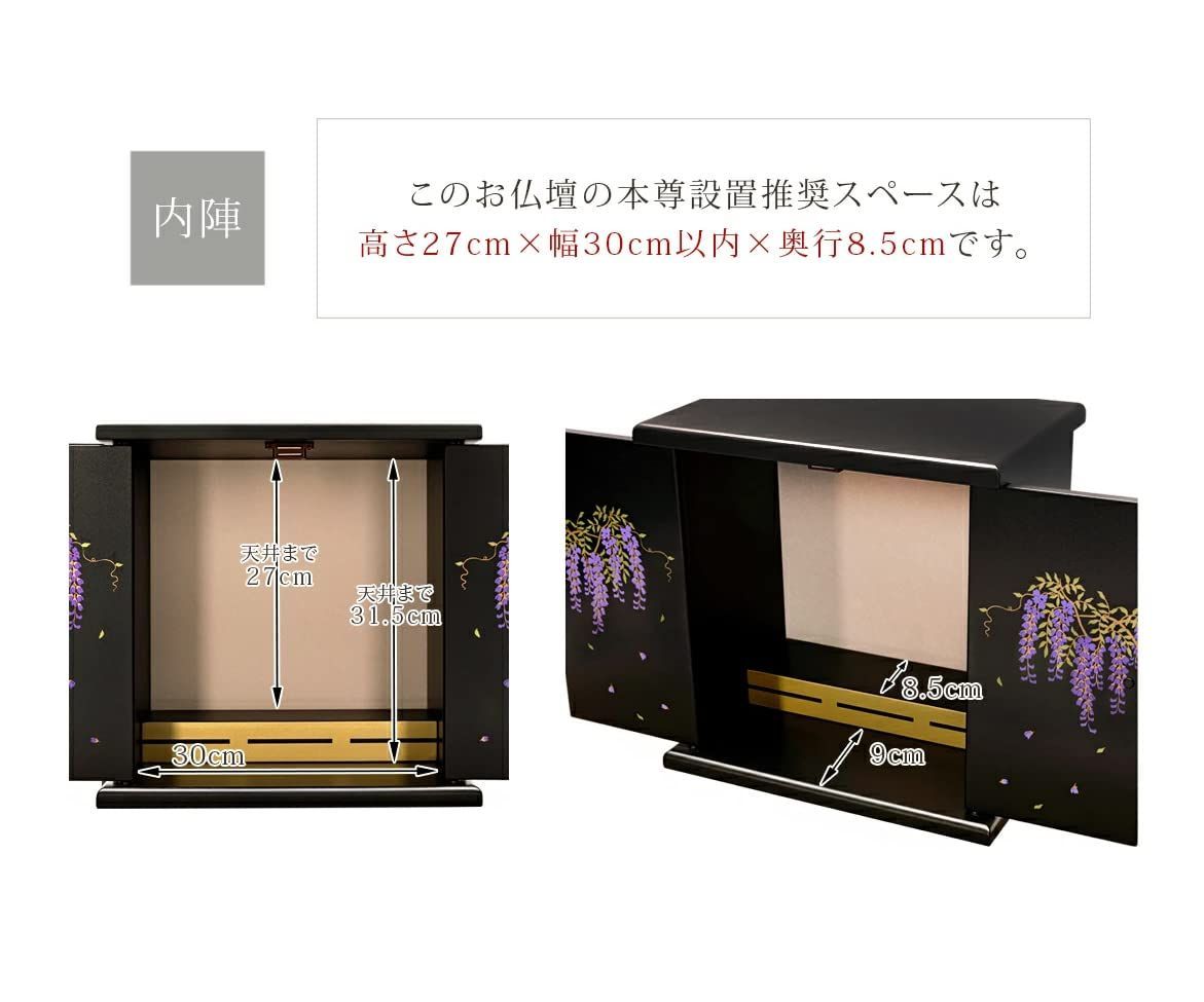 コンパクトで扱いやすいお手頃なお仏壇です。シンプルで場所を選ばないデザインとなっており、 扉を開くと両サイドには藤の花が鮮やかに描かれています。