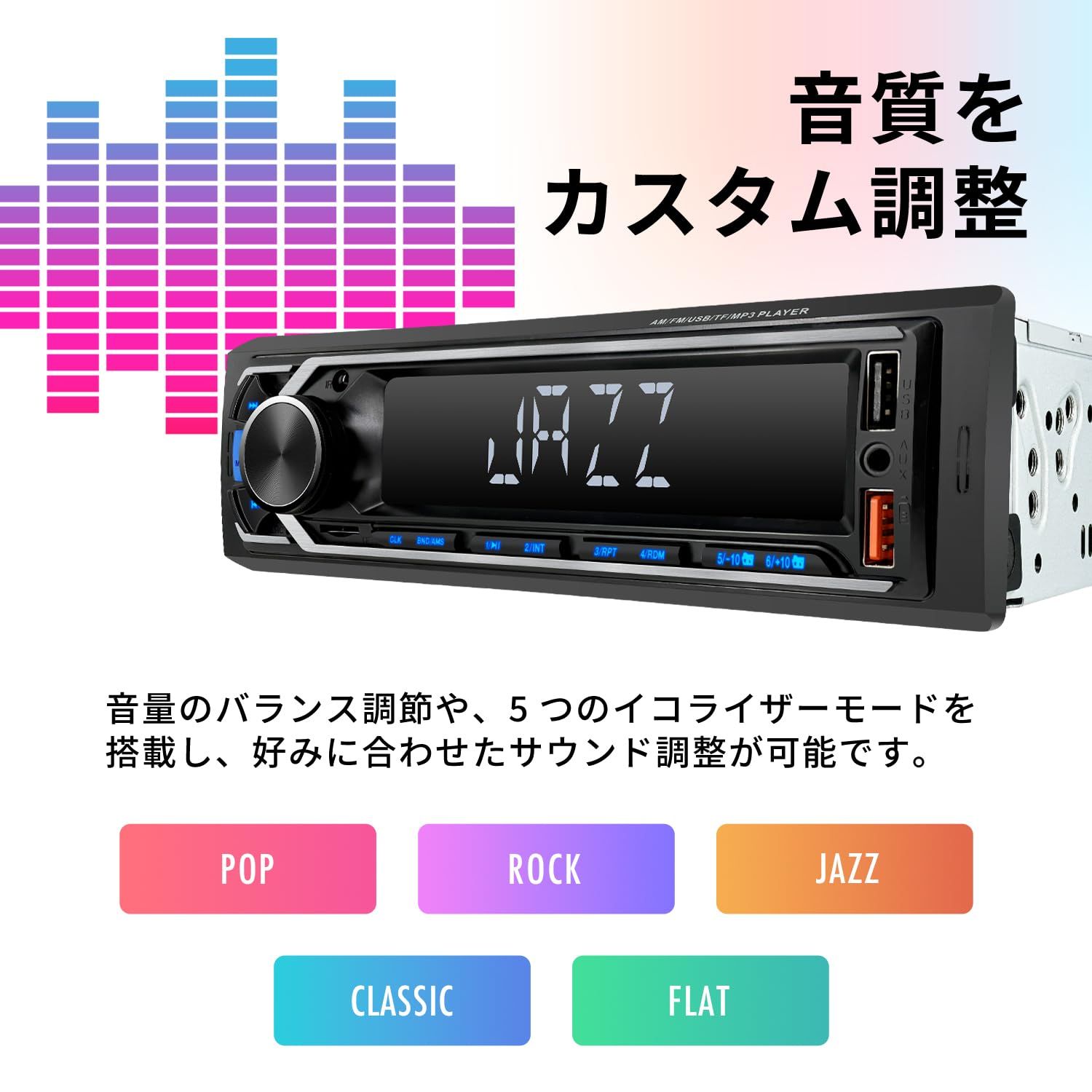 USBメモリーやmicroSDカードに保存されたMP3ファイルを再生。お気に入りの音楽を車内で楽しめます。