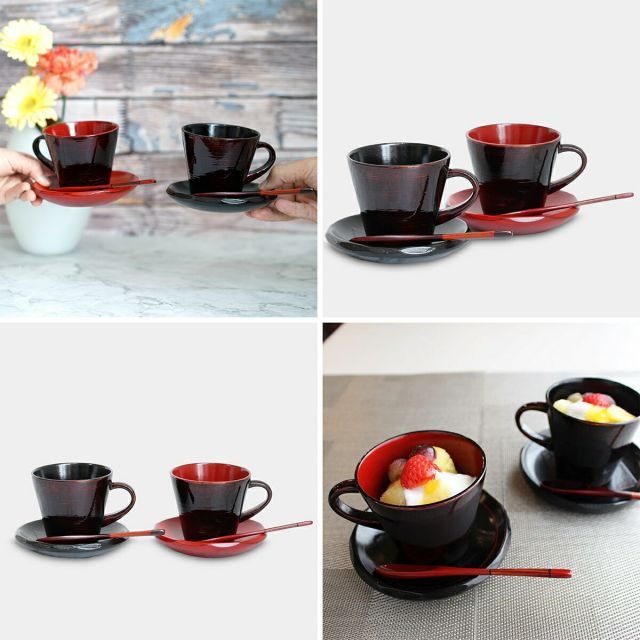 コーヒーカップ ソーサー 食器 マグカップ ティーカップ ギフト おしゃれ 天然木 木製 180 ml ブラウン 八雲塗 漆塗 和食器 国産 職人 海外 手土産 モダン セット 来客用 カフェ風 スプーン付 結婚祝い 新築祝い 新居祝い