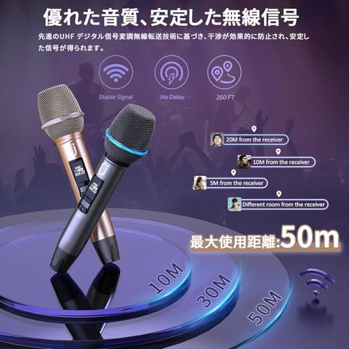 UHF伝送技術:最新のUHFテクノロジーを採用しており、より明確な信号とより良い音質を実現します。自動的にペアリング、複雑な操作は不要、ワイヤレスマイクとレシーバーは挿し込むだけでワンタッチで自動的にペアリングして、非常に使いやすいです。