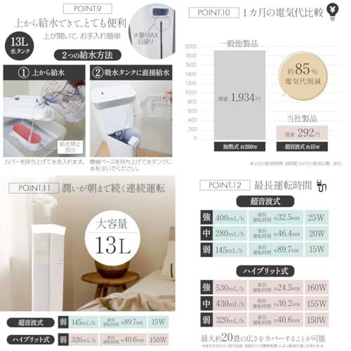 大型 ハイブリット式 加湿器 大容量 13 L 20畳 タワー型 タイマー機能 アロマ おしゃれ リモコン タッチパネルpo 179 d 38 e 8
