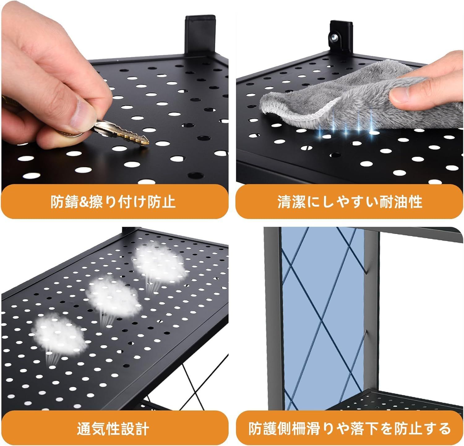 「頑丈で安心」 頑丈な炭素鋼を採用し、防サビ加工で仕上げ、耐摩耗性、耐油性がある。堅固で変形しにくい、重いものでも安心して設置できます。一段あたりの耐荷重約30KG、ご安心に使用します。