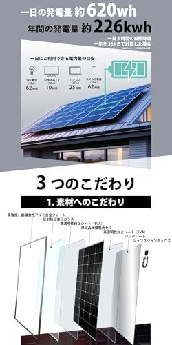 【簡単取付!】 フレームに開けられた穴で簡単な取り付けできます。アルミなので簡単に追加で穴を開けることもできます。ソーラーパネルには、MC4プラグとソケット付きの50cm 12AWGケーブルが付属しています。パネルの直列により、24Vまたは48Vシステムに対応。
