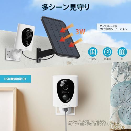 【大型ソーラーパネル搭載屋外設置想定・配線不要の完全ワイヤレス】 virtavo 防犯カメラは大型ソーラーパネルを採用し、充電出力3倍アップ。日中に太陽光で充電しながら運用でき、電源工事・配線作業が不要のワイヤレス監視カメラです。玄関・駐車場・ガレージ・庭など、コンセントが取りにくい場所にも設置しやすい設計。ネジ固定/粘着パッドの2通りの取付に対応し、設置場所を選びにくいのも特長です。※充電効率を高めるため、パネルは直射日光が当たる向きに設置してください。