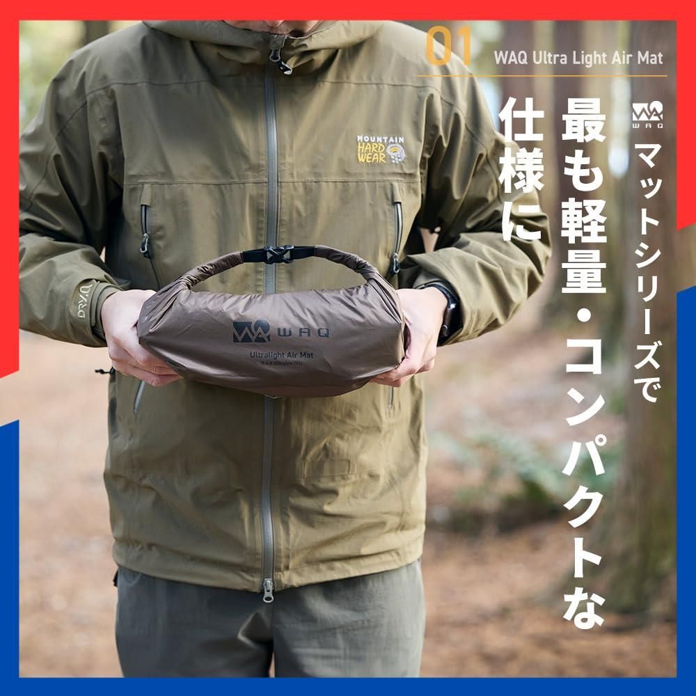 【WAQ Ultralight Air Mat】高R値、軽量、コンパクト3拍子揃ったエアマット。マミー型で約640g、スクエア型で約765gとWAQのマットシリーズ中で最も軽いマットに仕上がりました。軽量性を重視する方には最もコンパクトなマミー型、車中泊やキャンプなど積載に余裕があり快適性も両立させたい方はスクエア型がオススメです。