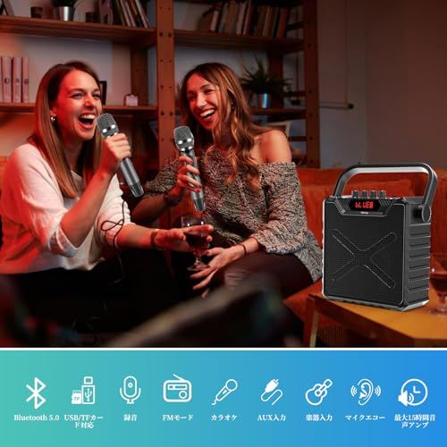 【多機能なカラオケセット】カラオケセットは複数の再生方式で選択できます。Micro TFカード再生、USB再生、AUX IN補助線で再生、FMチャンネルを検索して放送。スピーカーにはマイク受信機が内蔵されて、マイクスイッチを長押しすると2つのUHF無線マイクを自動的に接続して便利なカラオケモードに切り替えることができ、使いやすいです。マイクの音量サイズとマイクの残響モードを同時に操作してpartyを楽しむことができます。