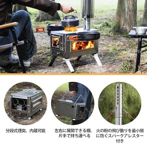 【収納サイズ60%節約】:?薪ストーブの脚は折り畳み式なので、コンパクトに収納可能、移動時に嵩張らずに持ち運ぶ事が出来ます。?付属の煙突は分段式で、パーツをすべて薪ストーブ内部に収納でき、片付けや持ち運びもス