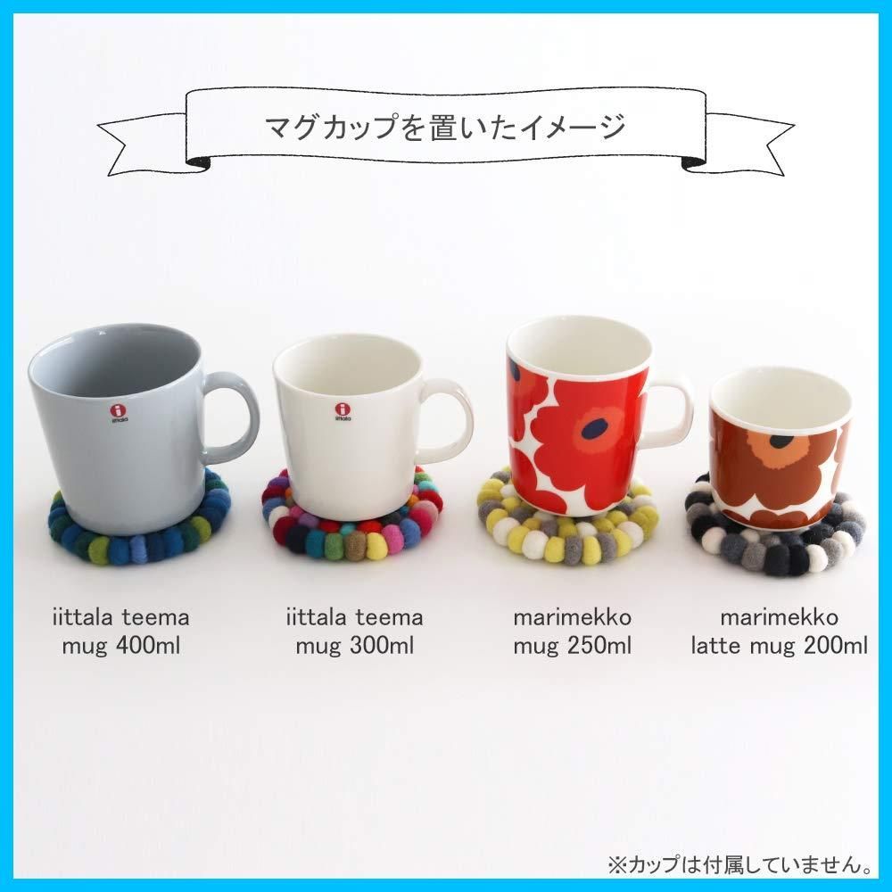 こちらは、1cm程の小さなウールボールを組み合わせた、ラウンドタイプのコースター2枚セットです。北欧らしい美しい発色と、フェルトの温かさが魅力のコースターです。温かいものの下に敷くだけでなく、冷たいグラスの下に使って水シミ防止にも。テーブルを保護するのにも役立ちます。見た目だけではなく、耐熱、耐久性にも優れてとても実用的。
