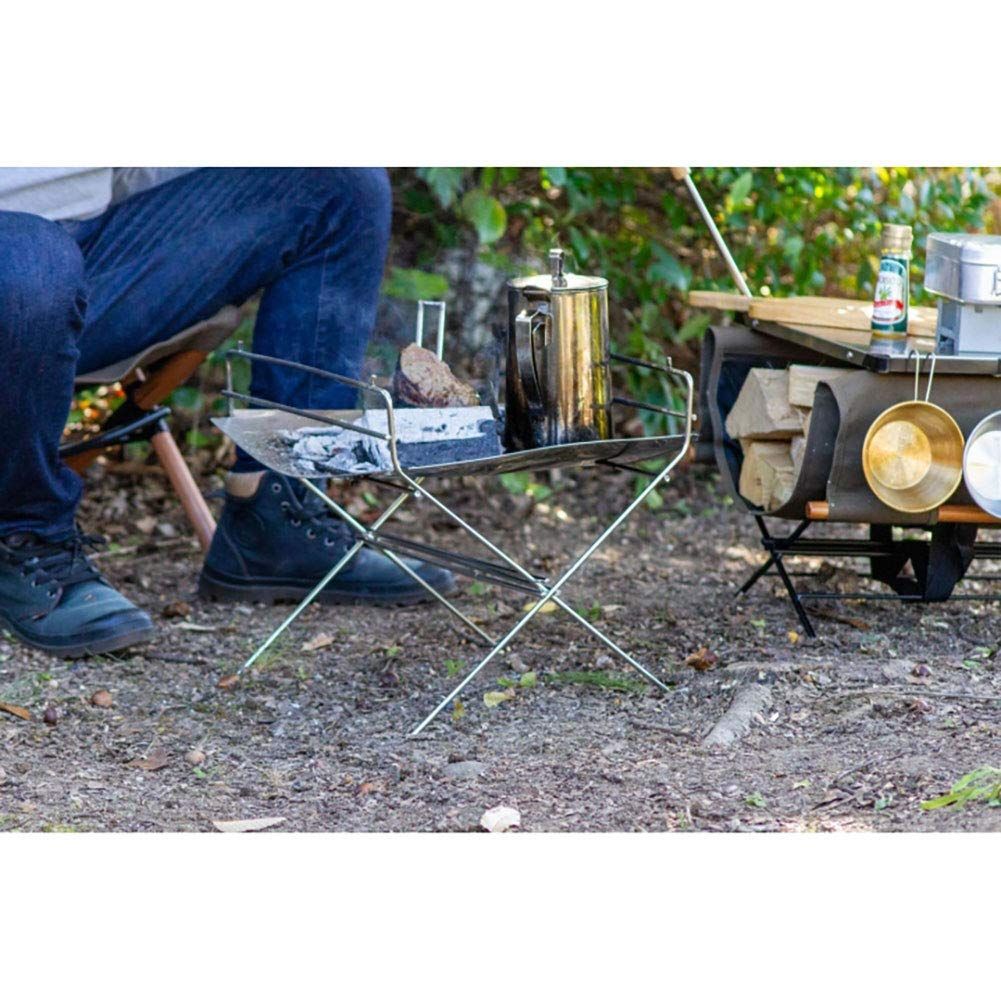 軽量でコンパクトになる焚き火台。2つの脚を組み合わせ受板をはめるだけの簡単組み立て。焼網も付属しており4人ぐらいのバーベキューでも使用可能。受板は一枚のステンレス板で灰処理や掃除が楽にできます。湾曲したところを空気が通り燃焼を助けます。