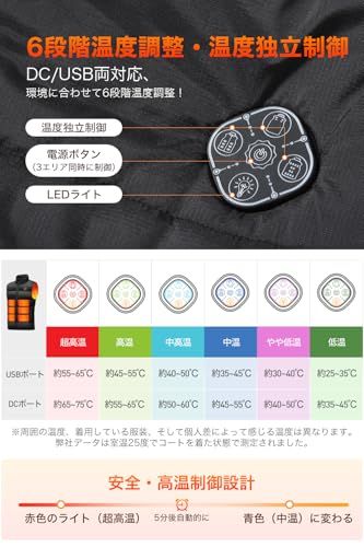 【3エリア独立制御・6段階調温】本製品の電熱ベストは、3つの加熱エリアを搭載しており、それぞれ独立したスイッチで個別にコントロールできます。さらに、電源スイッチ一つで3エリアを同時に操作することも可能です。電源スイッチの下にあるLEDスイッチで、表示灯の点灯・消灯を切り替えられます。温度は6段階で調節でき、DC/USBの2つの給電モードにも対応しています。用途に応じて自由にお使いいただけます。