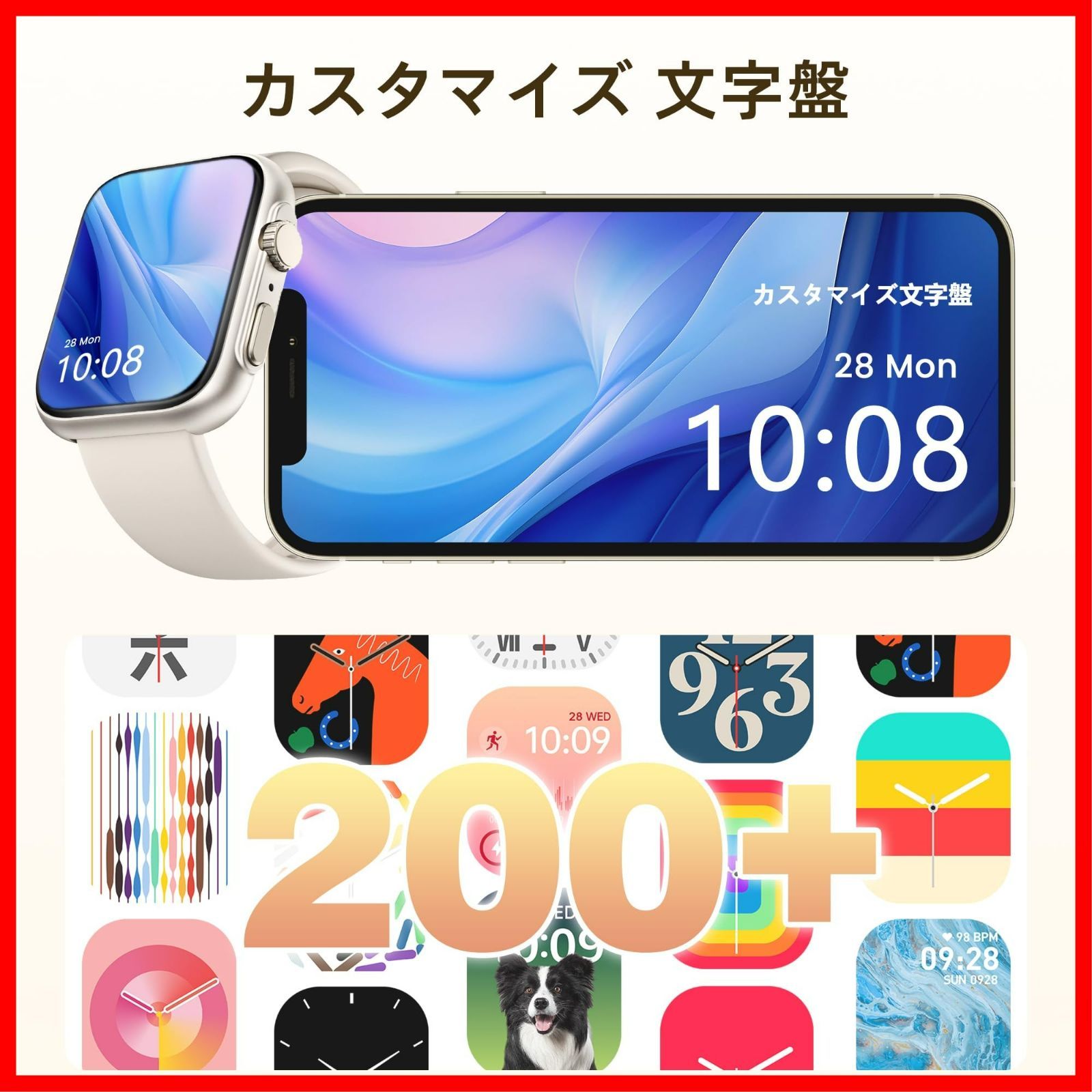 200+種文字盤・ファッションな四角型スマートウォッチ:当店のスマートウォッチは、ディスプレイに表示されるウォッチフェイスは専用アプリに200種以上ダウンロード可能、クラシックなアナログ時計風のフェイスや、デジタルなグラフィック、カスタマイズでお好きな写真を使ったフェイスなど、自分のスタイルや気分に合わせて変更できる点が魅力です。実用性を備えるため、父の日、母の日、敬老の日、クリスマス、新年、誕生日、記念日などに相応しいプレゼントです。