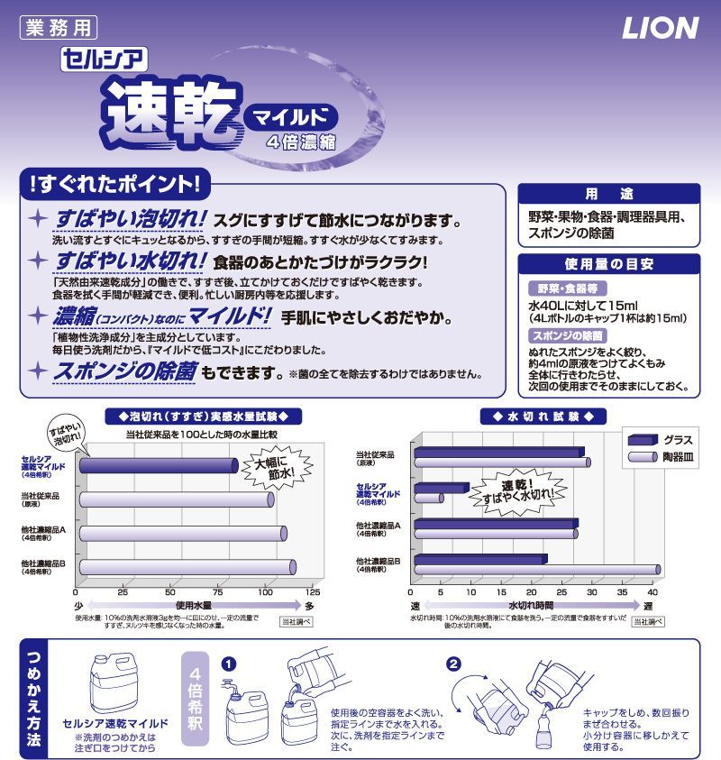 セルシア速乾マイルド4L4倍濃縮 ライオン 業務用 大容量 食器洗剤 すばやい泡きれ!すばやい水切れ!