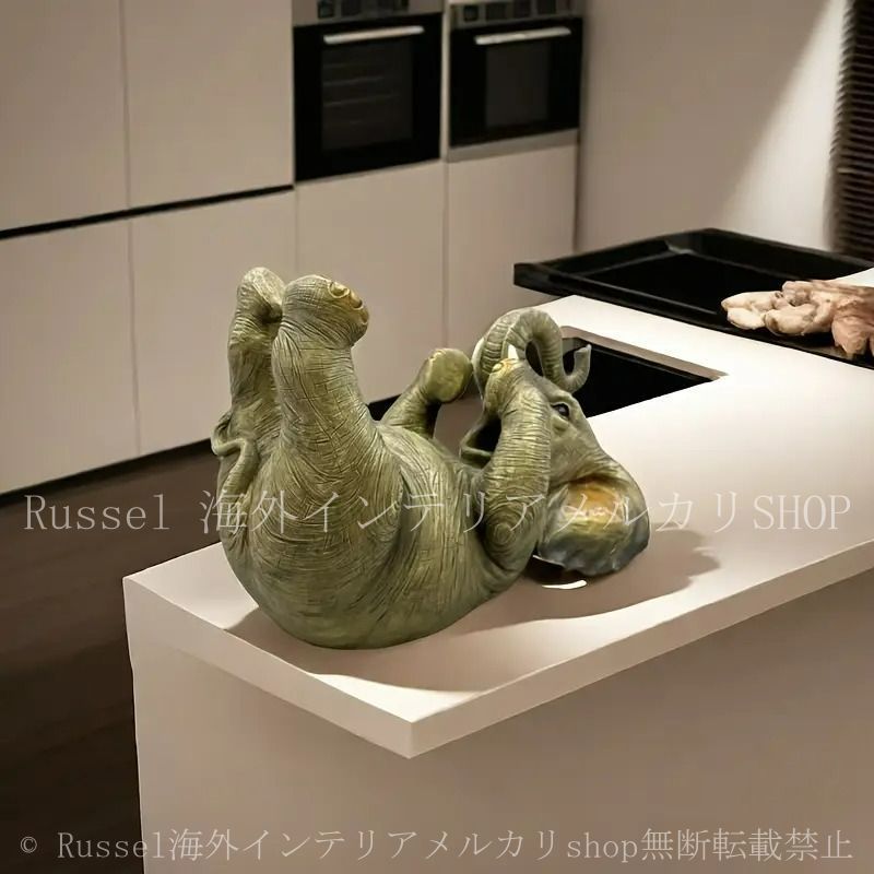 Russel海外インテリア、メルカリshop店のリアルなデザインが魅力の象のワインラック。寝転んでいるゾウの姿はユニークで、どんなお部屋にも遊び心をプラスする存在です。特に飲み会や特別な日を演出するアイテムとして、あなたのワインセレクションを華やかに引き立てます。手作りの精巧な造形が、見る人に喜びを与え、会話のきっかけにもなることでしょう。